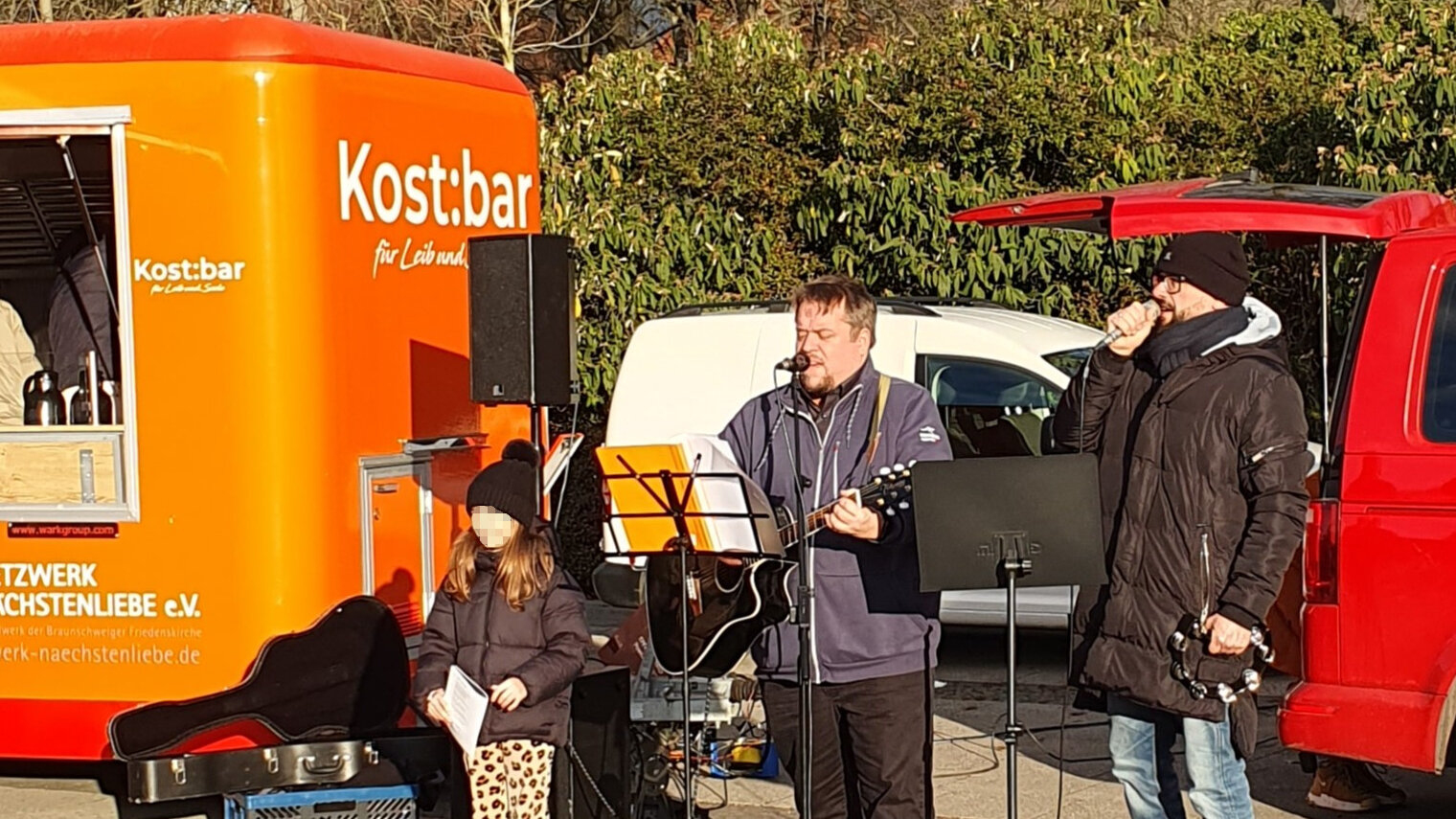 Dort wartete ein buntes Team von Mitarbeitenden der Kost:bar, von Neues Land e.V. und von HiOb vom Sozialwerk für Braunschweig mit Livemusik und gemeinsamen Weihnachtsliedersingen mit zwei Musikern, der Weihnachtsgeschichte, alkoholfreiem Punsch und Kartoffelsalat mit Würstchen.